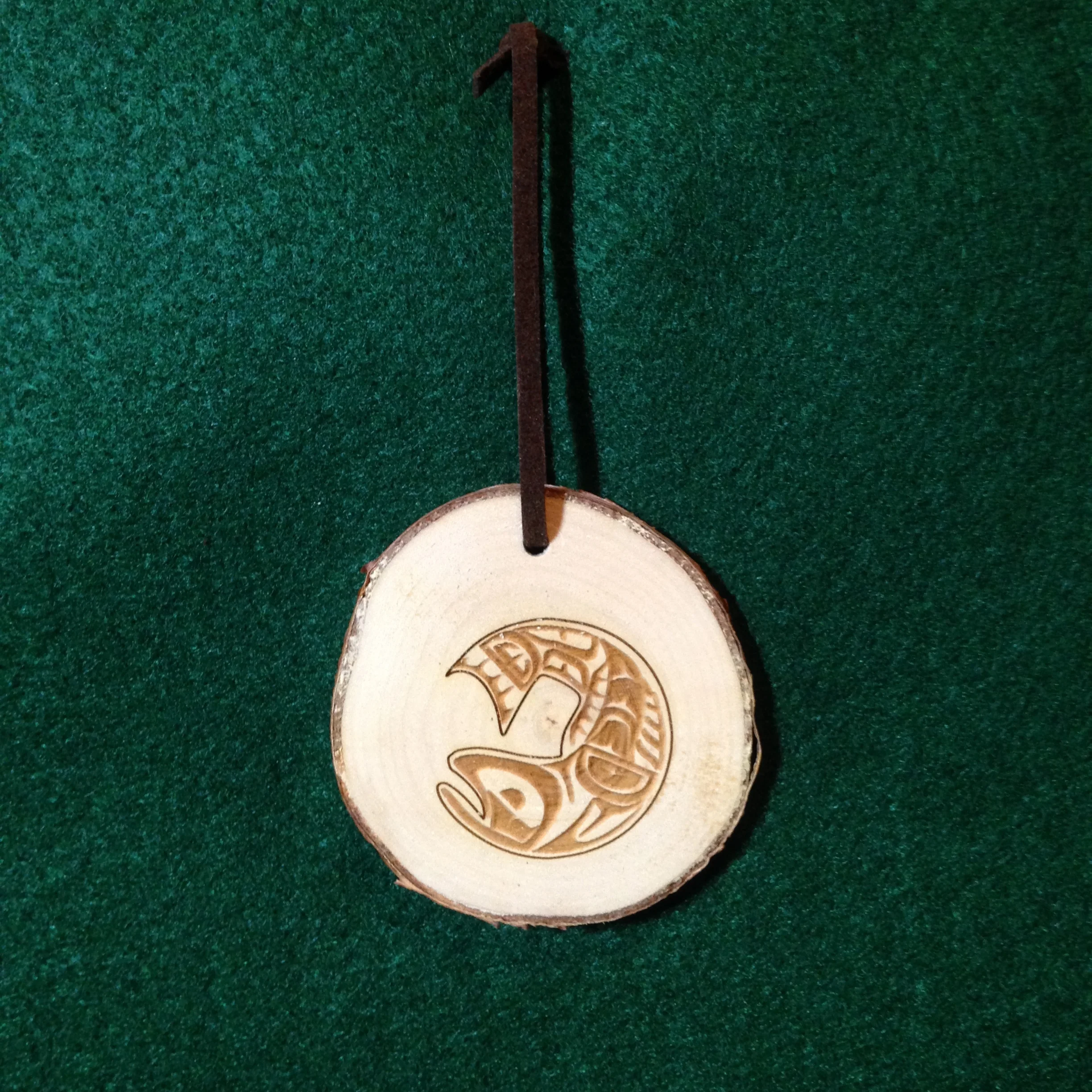 Our Alaskan birch ornaments are approximately 2 1/2" x 1/4" with a 3" hanger. Each design is hand made. The design is laser etched onto the disc and coated with lacquer to protect the ornament.